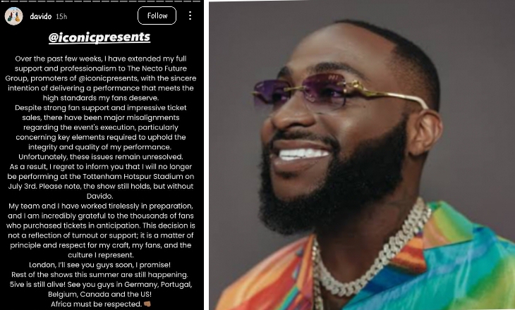 Davido is Standing His Ground after he abruptly cancelled his long-awaited July 3 concert at the Tottenham Hotspur Stadium in London.