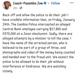“Back off and allow the police to do their job! I have credible information that, on Friday, January 24th, The Gambia Police intercepted an alleged Central Bank employee carrying $57,800 and D370,000 at a Jenoi checkpoint. Sadly, there are alleged attempts by a minister to kill the case. I have the name of the arrested person, who is believed to be part of a group of three, and photographs and video of the money being counted and handed over to the fraud unit. We expect the police to be allowed to do their job without interference or hindrance. We are watching closely”