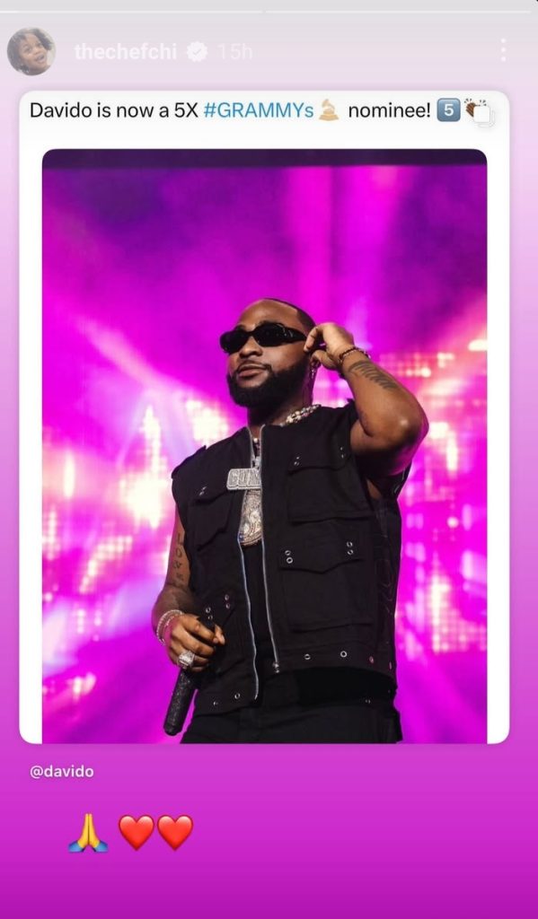 Reacting to the news, Chioma, via her Instagram story, reposted Davido’s post celebrating his nomination with grateful and love emojis