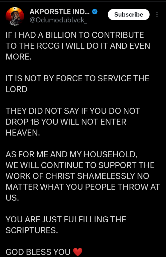 “If I had a billion to contribute to the RCCG, I would do it and even more. It is not by force to serve the Lord… As for me and my household, we will continue to support the work of Christ shamelessly, no matter what you people throw at us.”