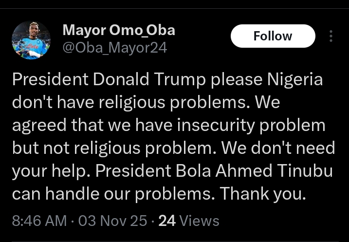 In reaction to the controversy, a Nigerian social media user, @Oba_Mayor24, directly addressed Trump on X (formerly Twitter).