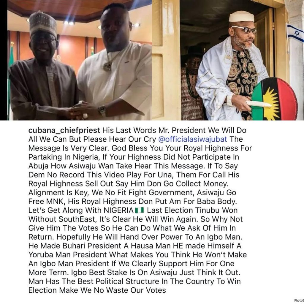 Socialite and entrepreneur Pascal Okechukwu, popularly known as Cubana Chiefpriest, commended a southeastern traditional ruler who called on President Bola Tinubu to either release Nnamdi Kanu from detention or deport him abroad.