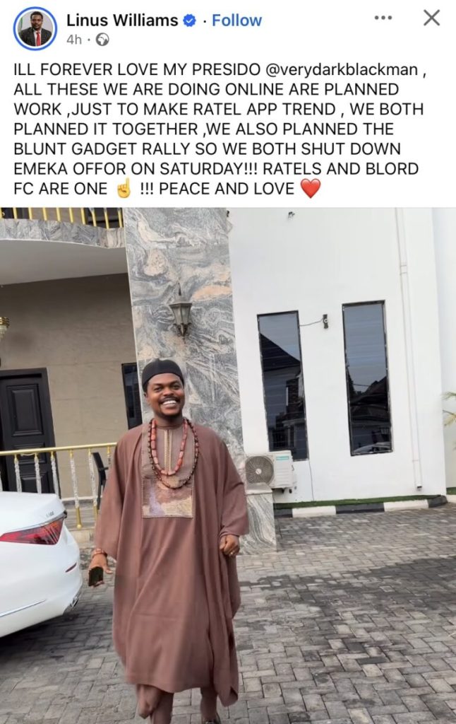 @verydarkblackman, ALL THESE WE ARE DOING ONLINE ARE PLANNED WORK, JUST TO MAKE RATEL APP TREND, WE BOTH PLANNED IT TOGETHER, WE ALSO PLANNED THE BLUNT GADGET RALLY SO WE BOTH SHUT DOWN EMEKA OFFOR ON SATURDAY!!!