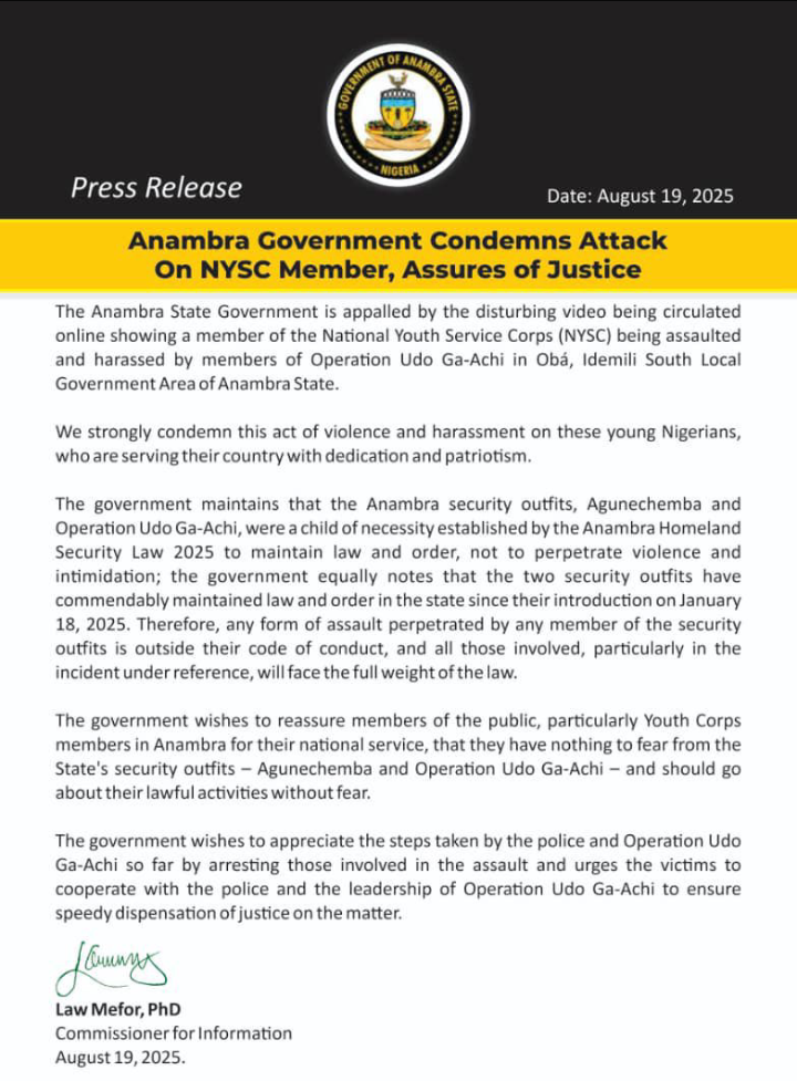 The Anambra State Government has taken decisive action in the aftermath of the viral assault on a female National Youth Service Corps (NYSC) member, announcing the sack of the vigilante officers involved and ordering their prosecution.