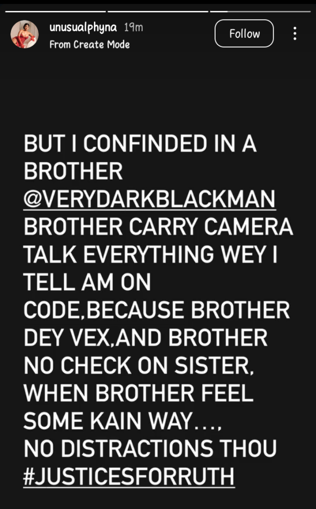 “But I confinded in a brother @verydarkblackman. Brother carry camera talk everything wey I tell am on code, because brother dey vex, and brother no check on sister when brother feel some kain way,”