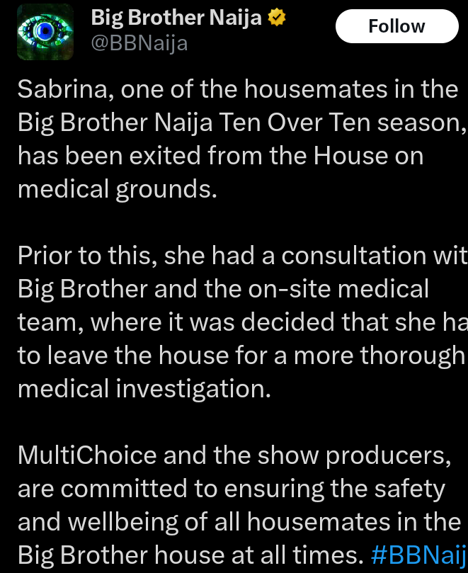 Sabrina’s exit serves as a reminder that, beyond the glitz, drama, and competition, BBNaija puts the wellbeing of its contestants first. The house will move on without her, but her absence will be felt by fellow housemates and viewers alike.