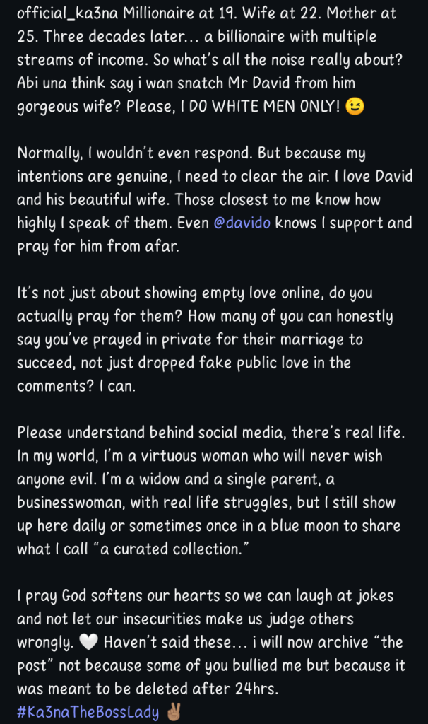 She also described herself as a virtuous woman, widow, single parent, and businesswoman navigating her own challenges, before urging followers to lighten up and stop letting insecurity lead to negative judgments
