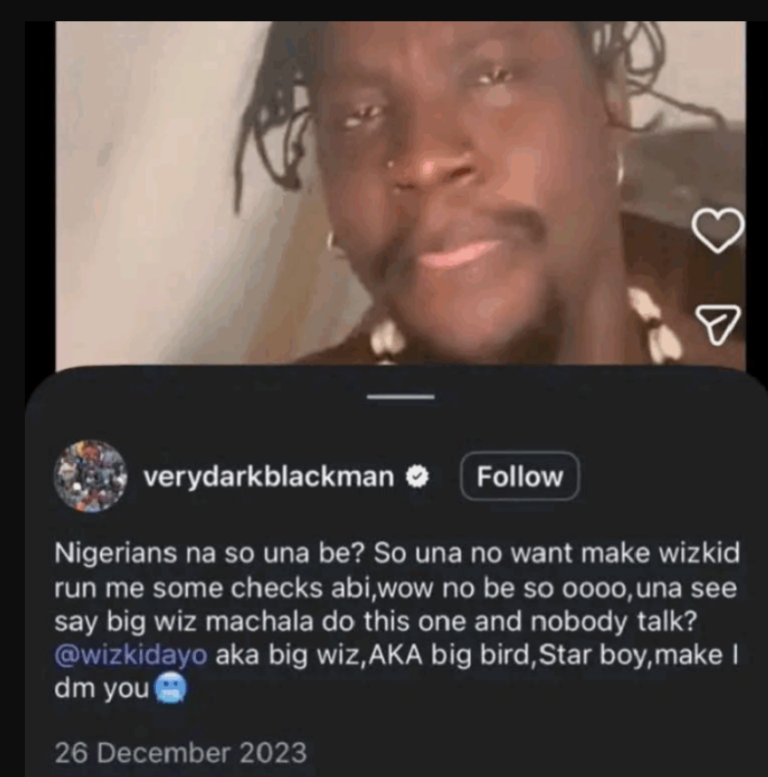 In the post, VeryDarkMan referred to Wizkid by several of his popular aliases and openly suggested that the superstar “run him some checks,” implying a request for financial help.