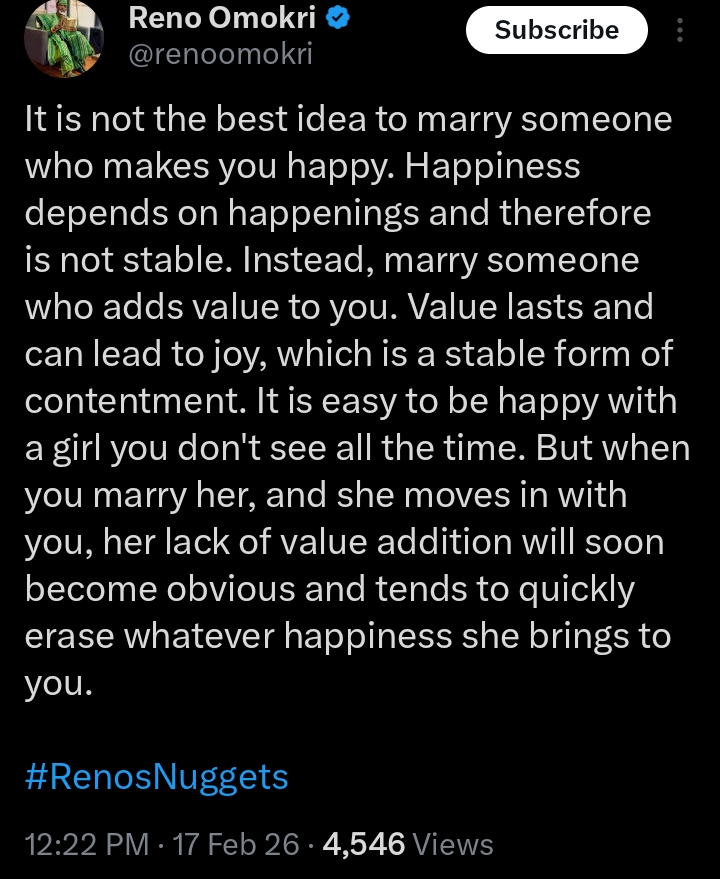 A fresh debate about marriage expectations has emerged online after former presidential aide Reno Omokri shared advice for men on choosing a life partner.