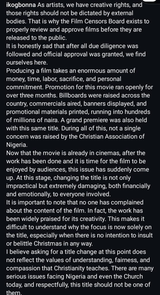 Nigeria: Nollywood Actor IK Ogbonna continues to speak out over CAN’s threat on Ini Edo’s New Movie ‘A Very Dirty Christmas’