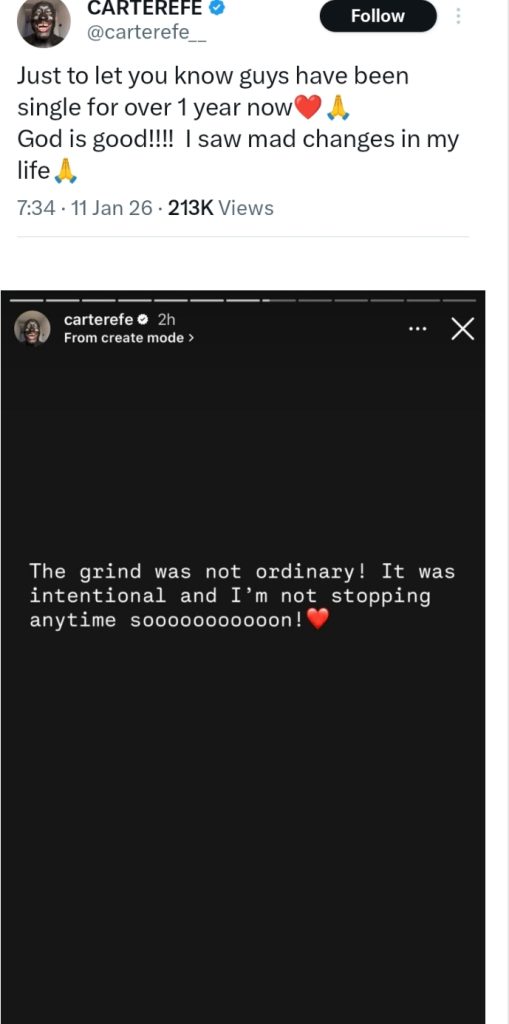 In a series of emotional posts, Carter Efe claimed that the relationship negatively affected his mental health, finances, and creativity, stating that he struggled to think clearly, create content, and maintain stability during that period.