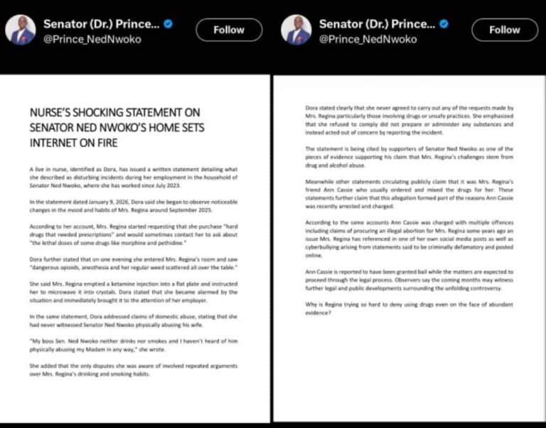 Senator Ned Nwoko has shared allegations from a household nurse who accused Regina Daniels of drug-related behavior, including requesting ketamine to be processed into crystals.