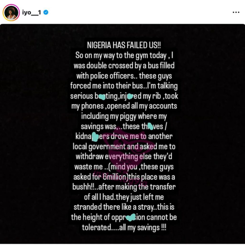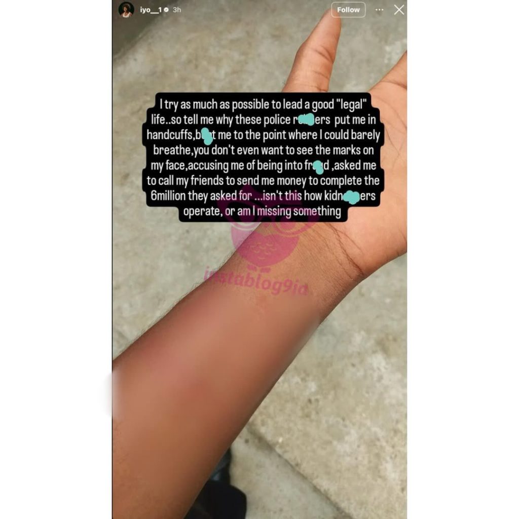 Media Personality Iyo has accused Police of Assault and ₦6m Extortion