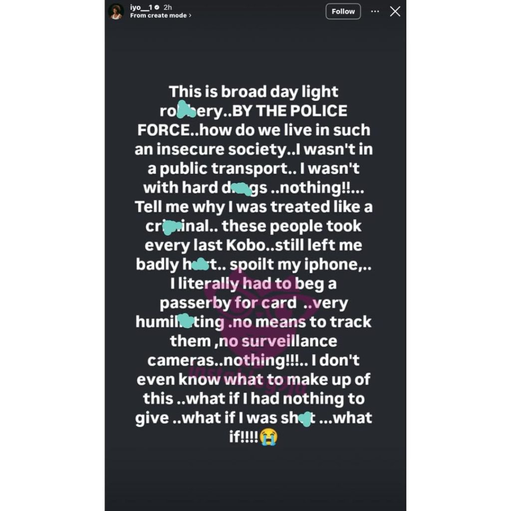 Nigeria; “They Took All My Savings”-Media Personality Iyo Accuses Police of Assault and ₦6m Extortion