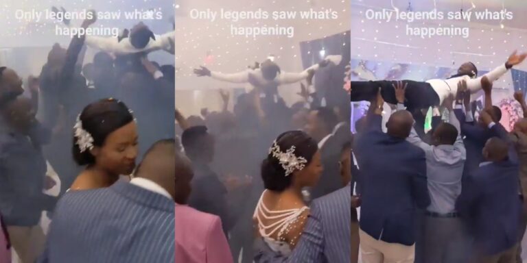 In the clip, the groom is seen being lifted horizontally by his friends while dancing energetically to a popular song commonly associated online with coffin-carrying pallbearers.
