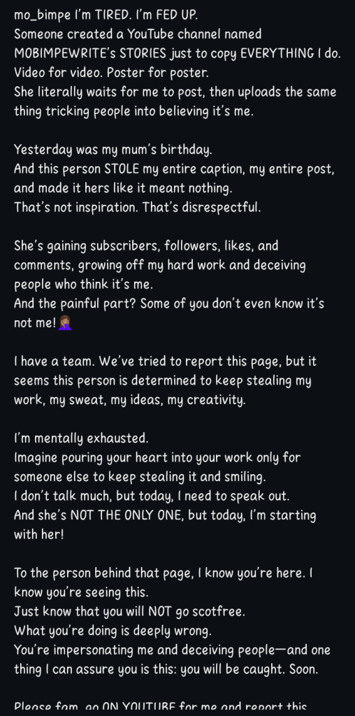 In an emotional Instagram post, she expressed, “I’M TIRED. I’M FED UP.” Mo Bimpe explained how the impersonator mirrored her birthday tribute to her mother, down to every word, and distributed it under their own name.