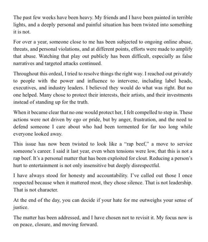 “This issue has now been twisted to look like a ‘rap beef,’ a move to service someone’s career.