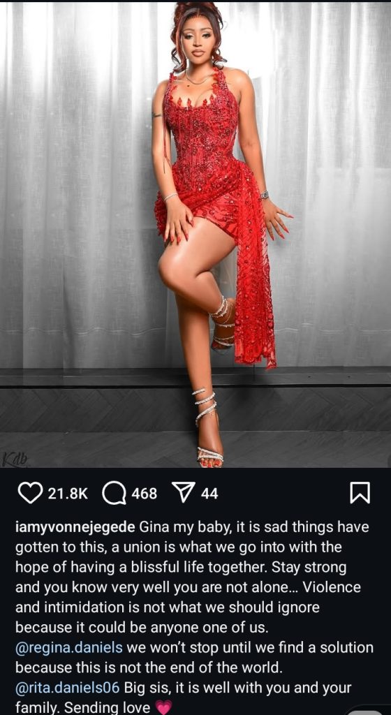 Nollywood actress Yvonne Jegede has assured her colleague, Regina Daniels, of her support as she battles her estranged husband, Ned Nwoko.