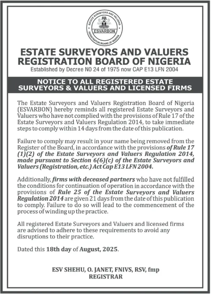 The Estate Surveyors and Valuers Registration Board of Nigeria (ESVARBON) hereby notifies all registered Estate Surveyors and Valuers who have not complied with the provisions of Rule 17 of the Estate Surveyors and Valuers Regulations, 2014, to take immediate steps to comply within 14 days from the date of this publication.