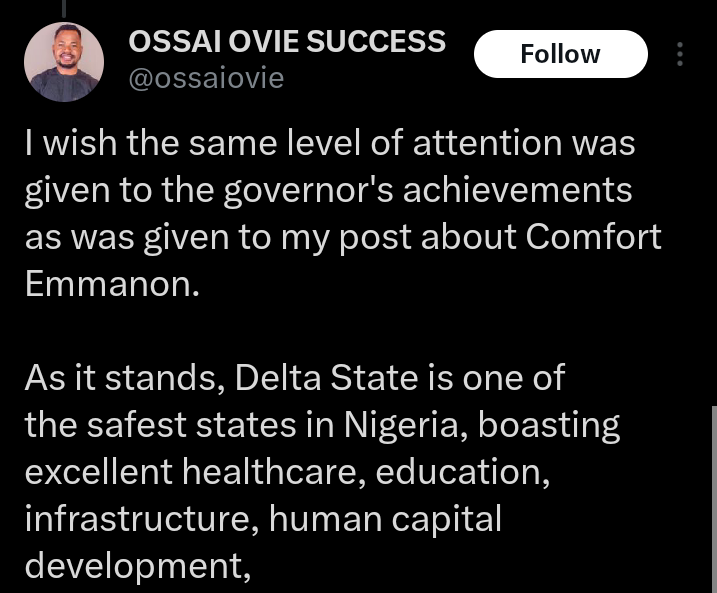 Controversial media personality Oyemyke(Abisoye Olukoya Michael) has sparked a new round of debate after claiming that the Senior Special Assistant (SSA) to the Delta State Governor, Ossai Ovie Success, may have ulterior motives for offering Comfort Emmanson a ₦500,000-per-month job and an all-expense-paid vacation.